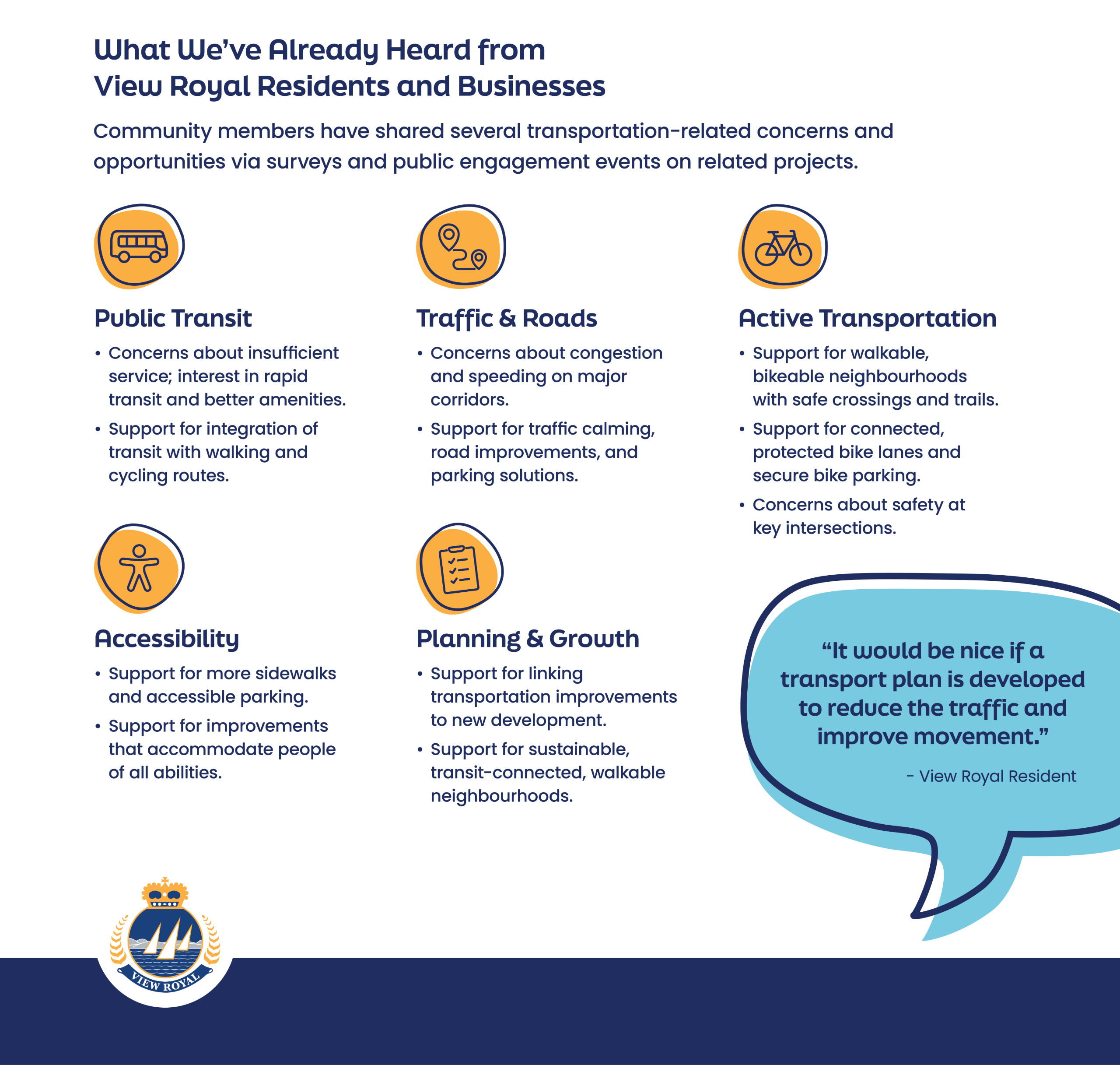 We will share what we know about transportation in View Royal today, including existing conditions, challenges, and opportunities. We’ll present the progress made since the last TMP, along with the feedback received through the recent engagement on the Official Community Plan (View Royal 2050) and the View Royal Active Transportation Network Plan 2023.